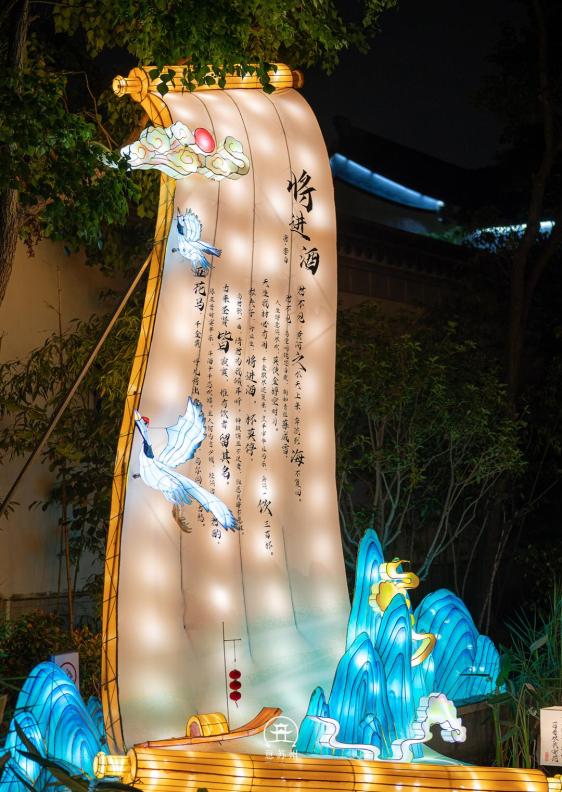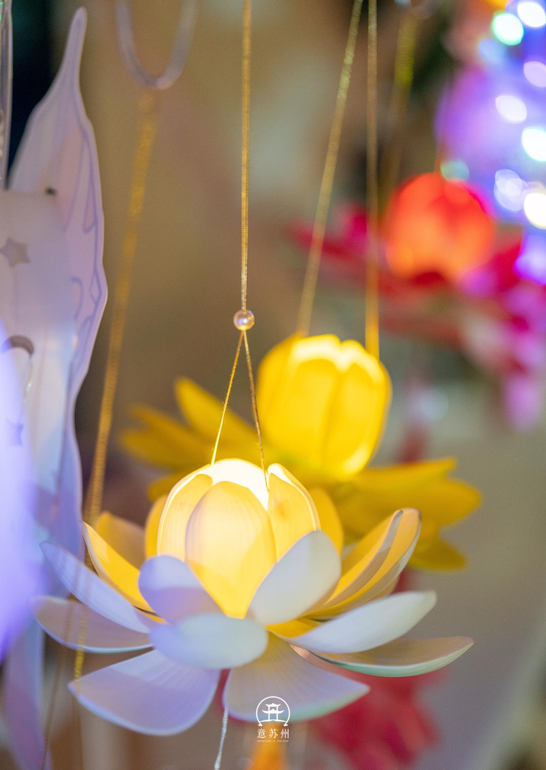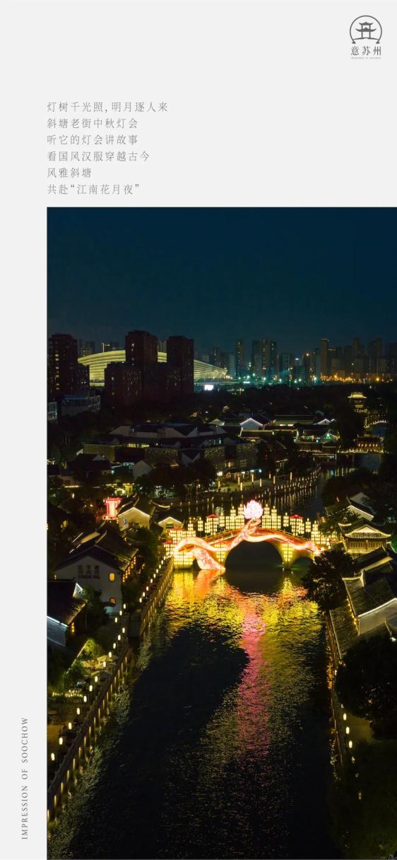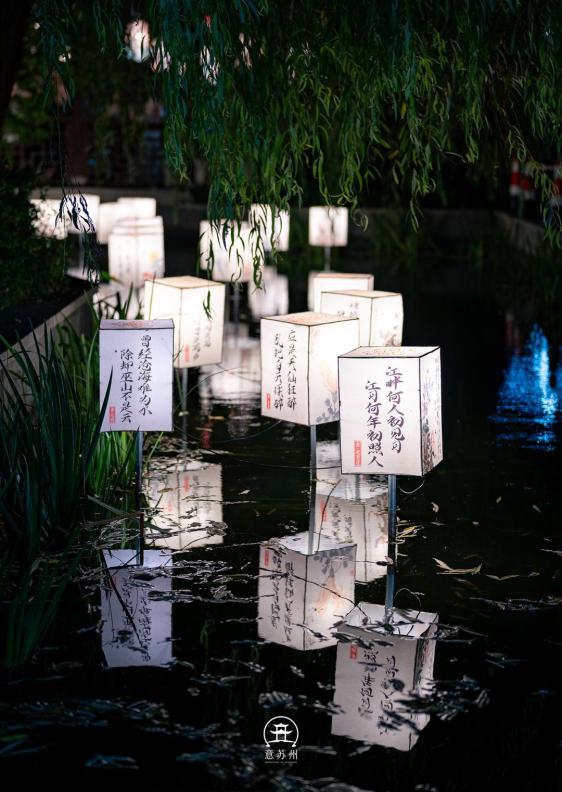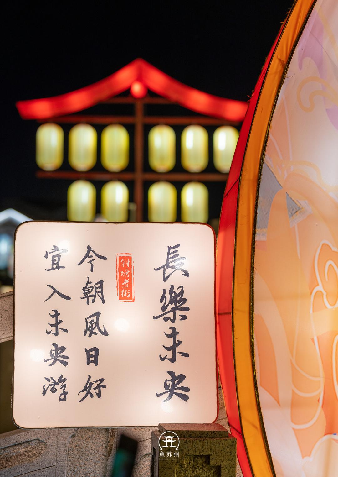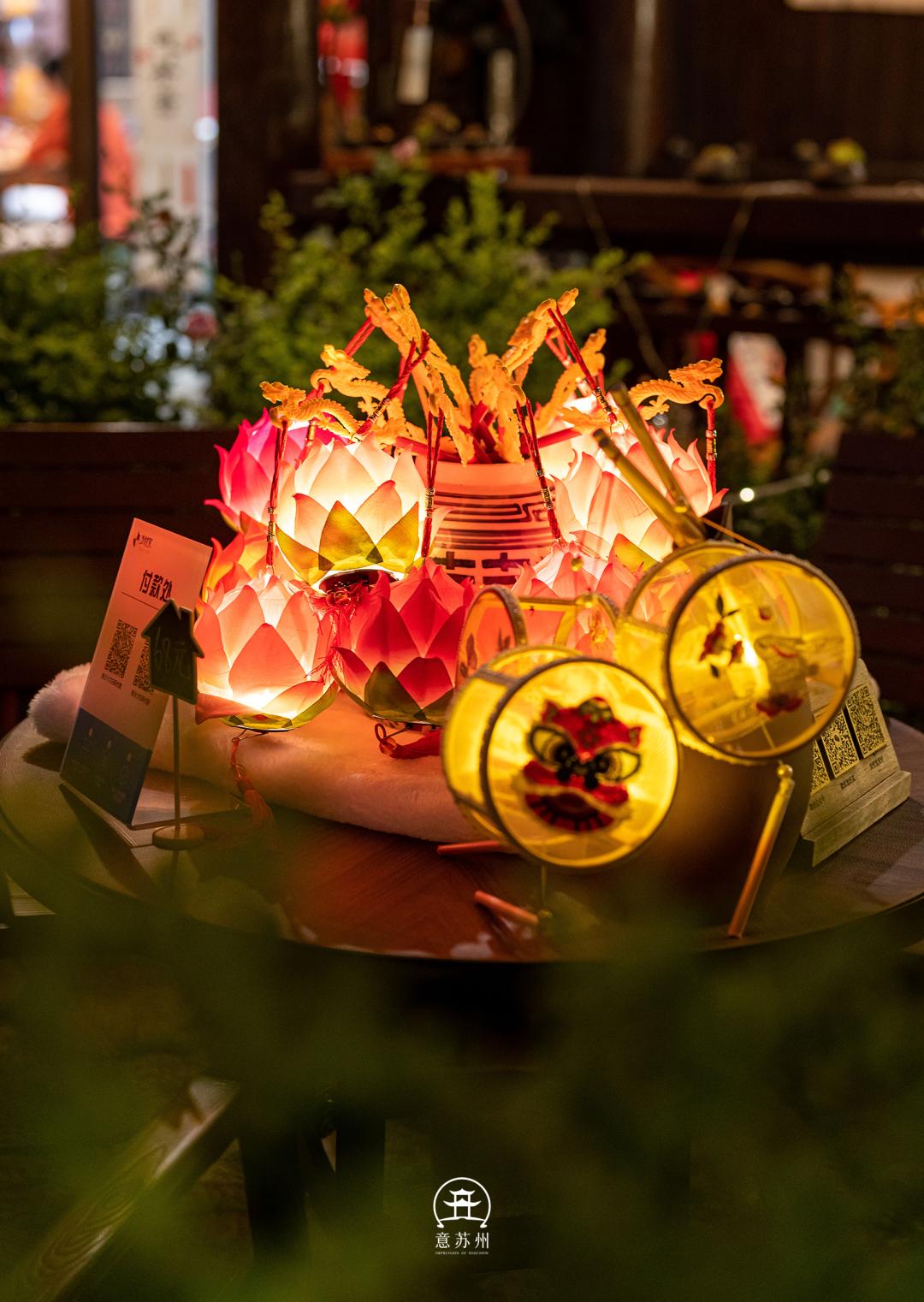 斜塘老街结合国家级非物质文化遗产苏州灯彩及园林式街区建筑特色,与汪筱文老师团队合作,从诗歌、书画、乐舞等方面,深入挖掘传统审美精神、审美趣味和审美风尚元素,通过灯彩组景的形式呈现。