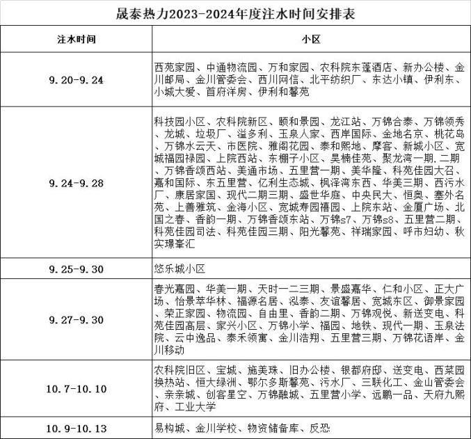 2023-2024年度采暖期临近,供热前期准备工作正在紧张有序地进行中,为确保区域内热用户今冬明春正常安全用暖,晟泰热力公司定于2023年9月20日起(各小区具体注水时间详见下表)陆续对您所在的小区进行全天24小时不间断供热管网系统注水工作。