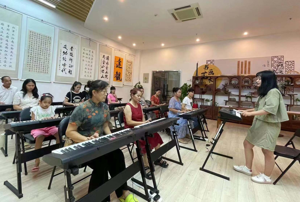 ↑龙海村村民参加电子琴兴趣培训活动。