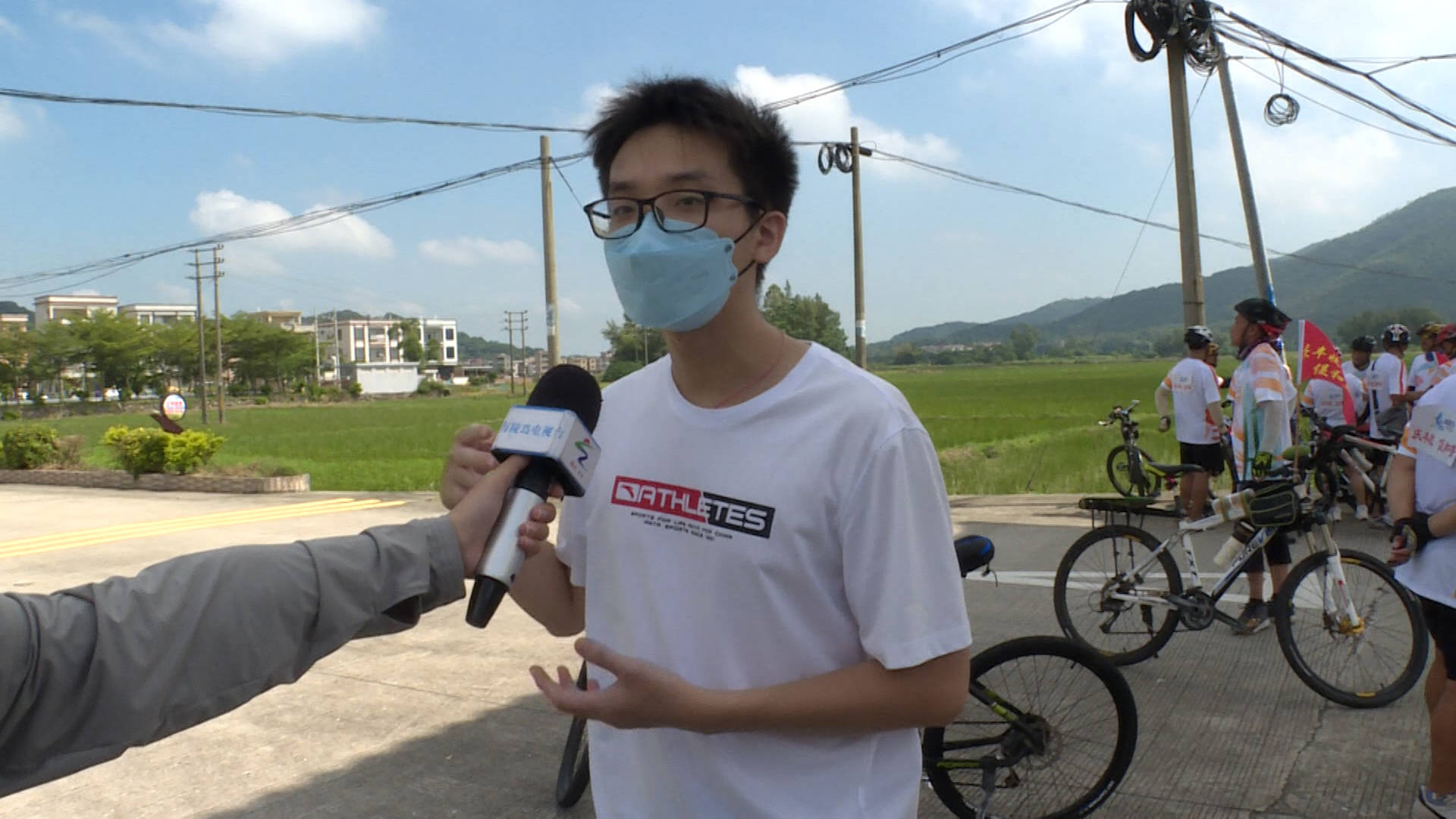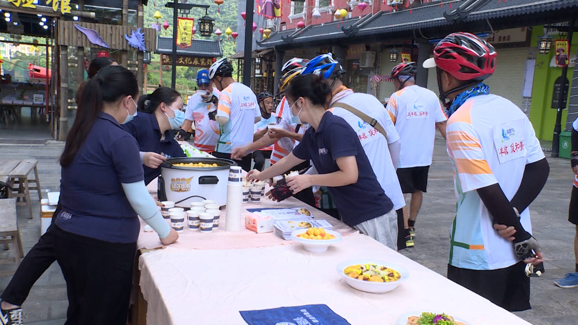 工作人员 王元毅:因为今天是秋分时节,也正好碰上丰收节,我们农民大家就组织一下参加这个活动,用骑行的方式去游览一下海岛上的一些风光美景,也邀请(联合)了一些企业,来举办(特色美食展),展现我们海陵岛特有的、特色的小吃之类的。宣传我们海陵风光特色风光和特色美食。