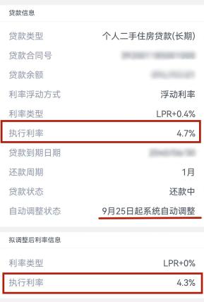 手机银行显示,他原先利率类型为LPR+0.4%,执行利率为4.7%,由于他在2020年买房,下调后,利率类型为LPR+0%,执行利率为4.3%,相当于每月利率下降了0.4%。