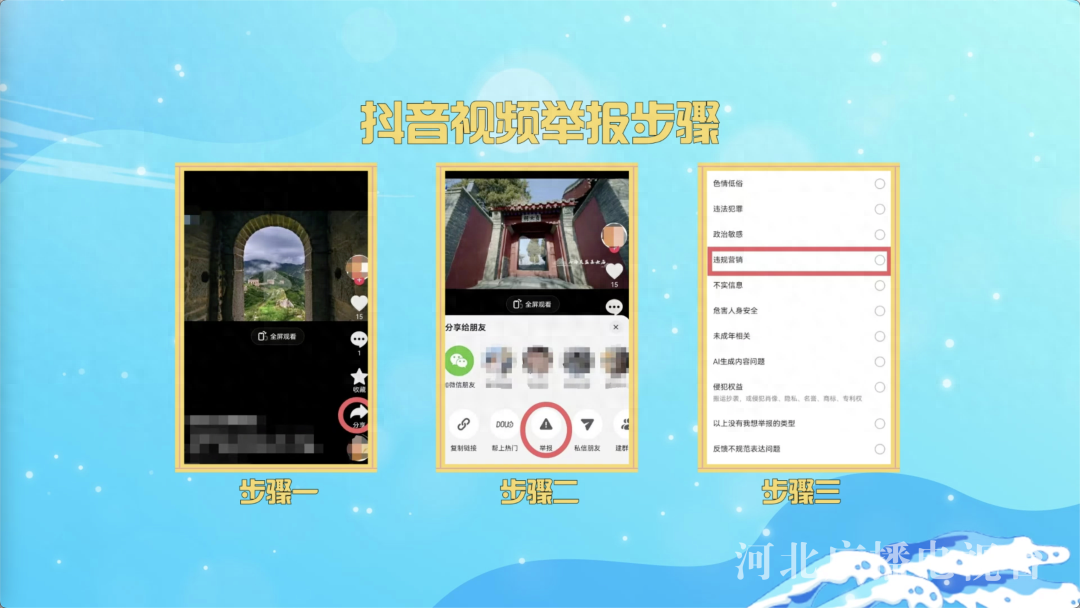 (1)向网站平台举报。国内各大网络平台都有受理举报端口,比如微信、抖音的每条信息的页面都有很方便的举报投诉菜单。