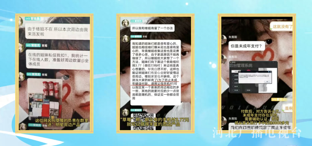 不法分子常常利用同学们对偶像的好奇、向往,在各种社交平台和视频软件中,发布明星粉丝群二维码,不少同学出于好奇心扫码入群,对方会以领取明星礼物、粉丝应援等理由哄骗转账,或者威胁同学因为泄露了明星的隐私,或以未成年人付款导致平台被有关部门冻结为由要求赔偿,并威胁要报警抓走父母,迫使同学转账平事。未成年人缺乏社会经验和法律意识,遭遇这种恐吓和威胁,很容易陷入恐惧,任其摆布。