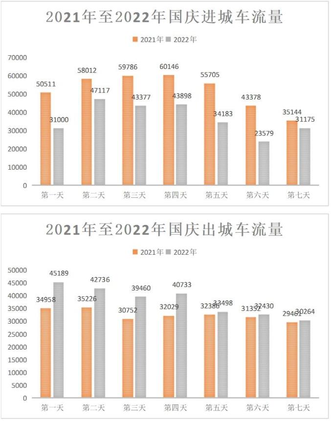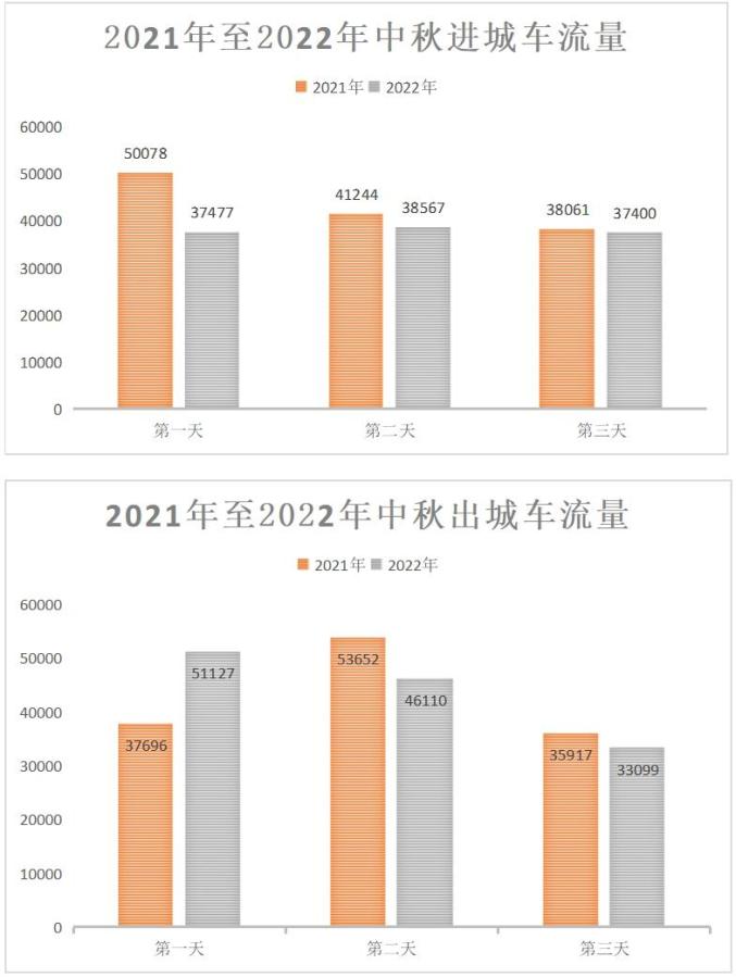 近两年(2021年—2022年)我市中秋期间进城日均车流量在4万左右,出城日均流量4.2万左右。市区主要景区如侨港、银滩等日均车流量在1.1万左右。