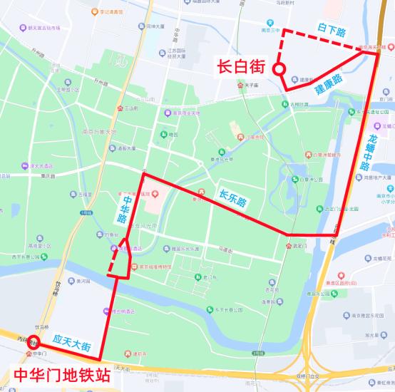 中华门地铁站9:30-19:30、长白街10:00-20:00。线路自“中华门地铁站”站起,沿应天大街、雨花路、中华路、长乐路、龙蟠中路、大中桥、(建康路)、(←白下路)、长白街至长白街站(路东侧)往返行驶,沿途经过以下站点:中华门地铁站、大报恩寺遗址公园、中华门城堡、市第一医院、琵琶巷、武定门、七里街、长白街(路东侧)。