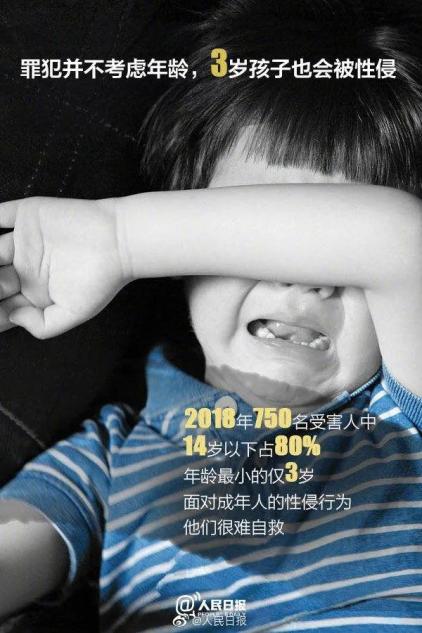 侵害可能发生在任何年龄段,甚至几个月大的婴儿身上。2015年,福建南平一名6个月大的女婴在父母补办婚礼时被堂叔抱走侵害,导致下体大量出血。还有个上海的孩子,被侵害时才两个月大。据女童保护组织统计,2018年公开曝光的案例中,7~14岁受害者最多,最小的3岁。美国国家失踪及受虐儿童中心的研究也表明,12岁以下的儿童中,4岁宝宝被侵害的情况最为严重。