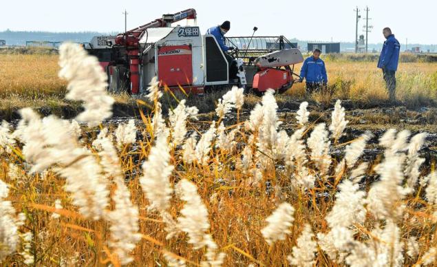 在吉林省大安市海坨乡盐碱地生态修复治理示范基地,农民驾驶收割机收割水稻(2022年10月12日摄)许畅摄 / 本刊