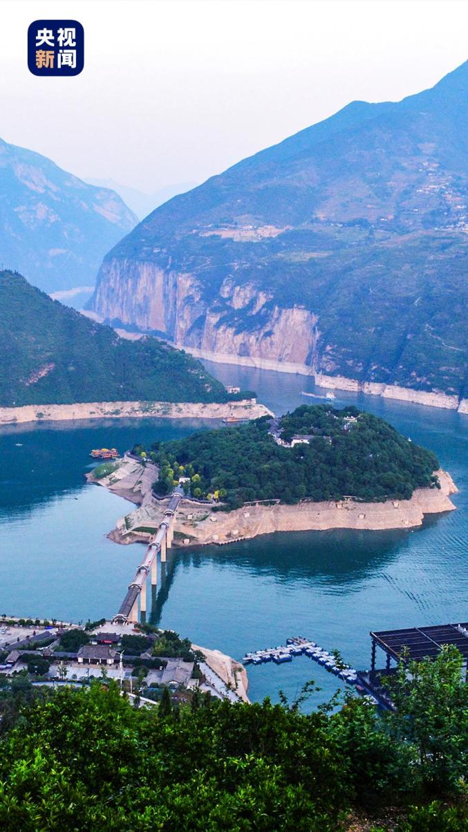 三峡工程蓄水后,水位抬高至175米,四面环水的白帝城已成为“高峡平湖”中的一座“绿岛”。