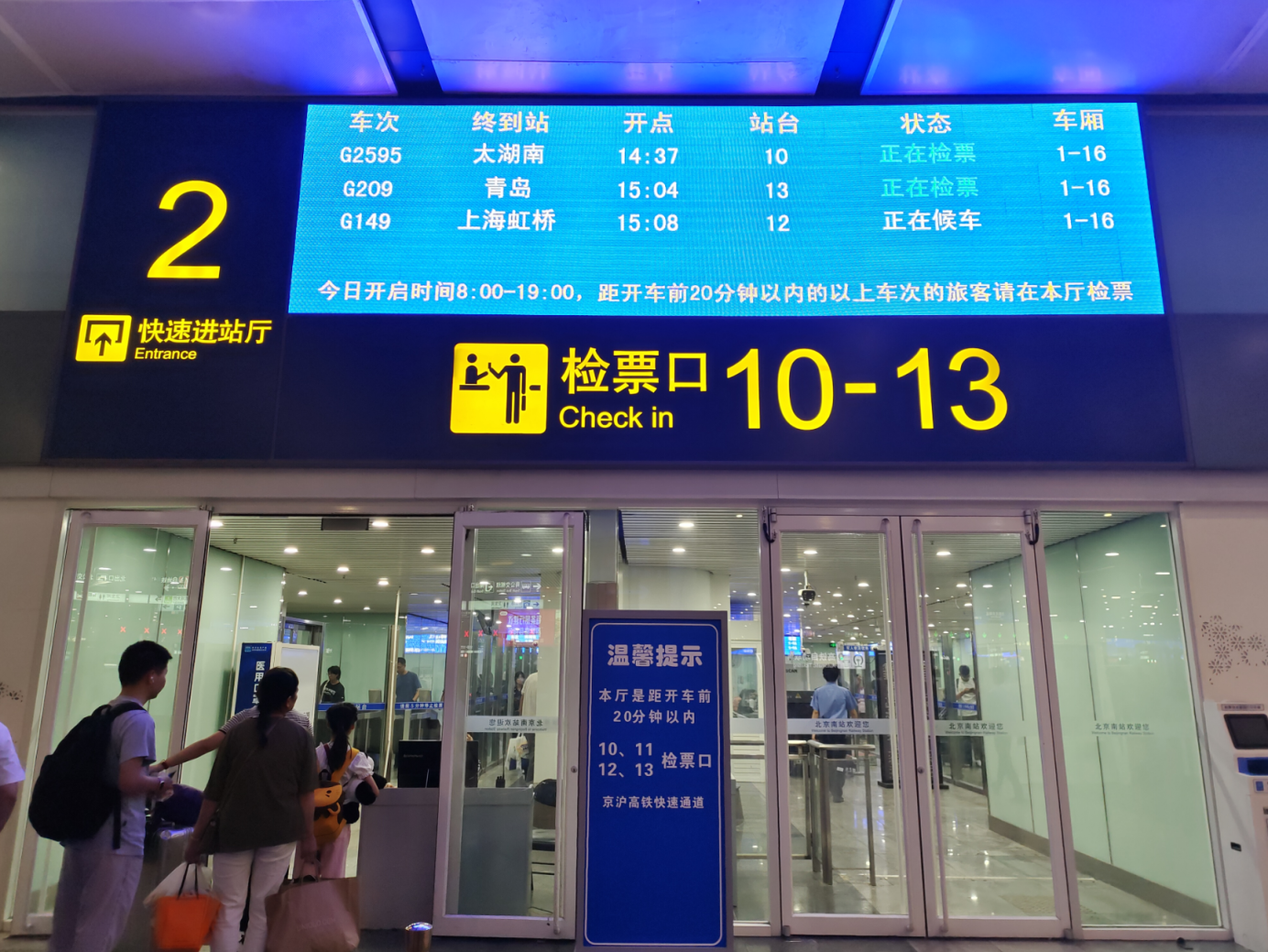 “今天时间有点儿紧,但走快速进站厅特别方便,从出地铁到检票上站台,只花了5分钟。”乘车去上海的陈先生说。记者注意到,假期前一日,北京南站已经全面开启地下一层京沪高铁、京津城际4个快速进站厅,不少列车出发时间临近的旅客出地铁后,直接在同层快速进站,不必再上楼候车。“快速进站厅每日开关时间,将根据现场客流情况动态延长调整。”工作人员介绍。