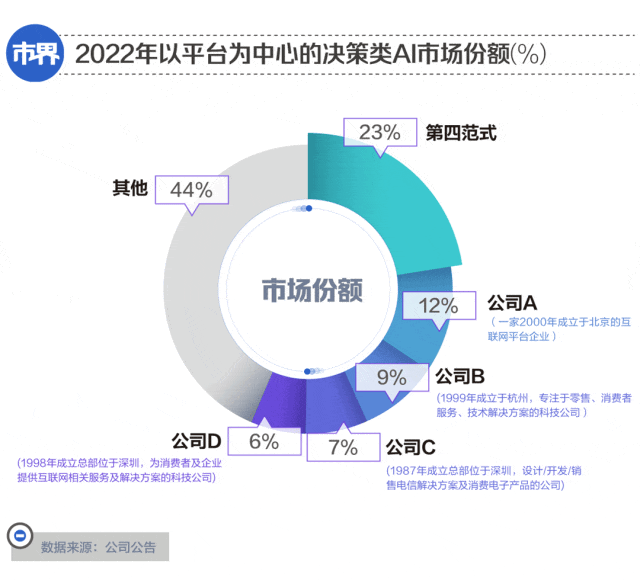 灼识咨询报告则显示,以2022年收入计算,国内以平台为中心的决策人工智能市场中,前五名总计占据了56.1%的市场份额,其中第四范式以22.6%的份额名列第一,远超占比12.3%的第二名。