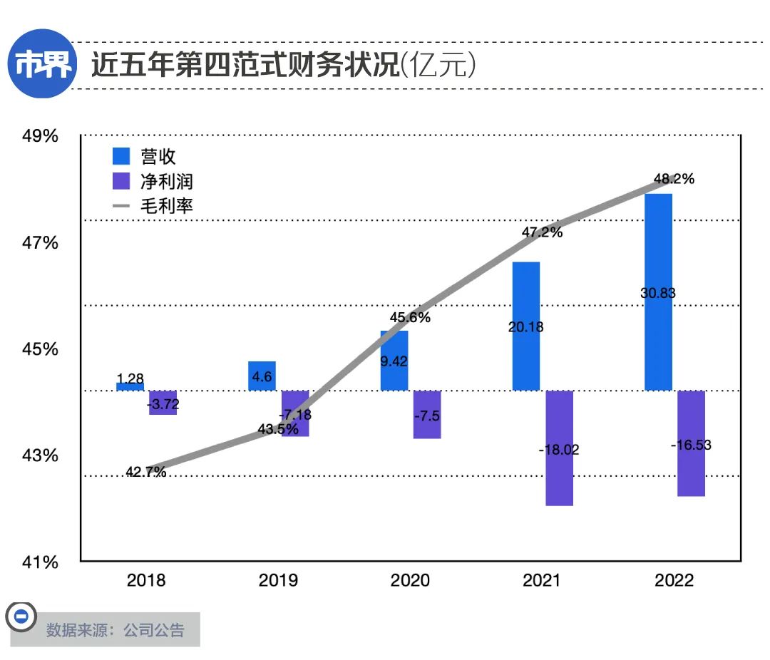 整体来看,2020、2021、2022年第四范式营收逐年攀升,分别为9.42亿元、20.18亿元、30.83亿元。但从盈利角度,至今公司仍陷在亏损之中,2020、2021、2022年亏损金额分别达7.5亿元、18.02亿元、16.53亿元,三年合计亏损金额超过了42亿元。