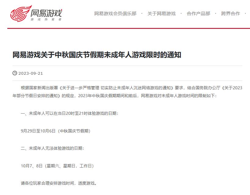 国家新闻出版署于2021年8月下发通知,严格限制向未成年人提供网络游戏服务的时间,所有网络游戏企业仅可在周五、周六、周日和法定节假日每日20时至21时向未成年人提供1小时服务,其他时间均不得以任何形式向未成年人提供网络游戏服务。按照通知的相关限玩规定,其他游戏厂商对于未成年人寒假暨春节假期限玩时间安排将与腾讯游戏一致。