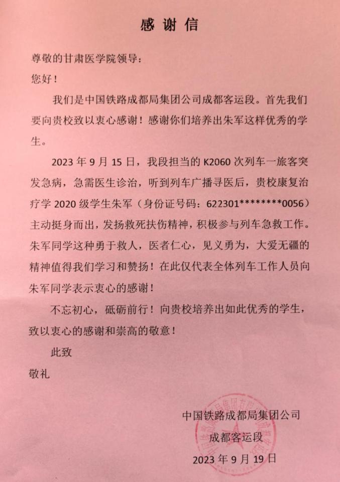 9月25日,甘肃医学院收到来自中国铁路成都局集团公司成都客运段发来的感谢信。信中写道:9月15日,我段担当的K2060次列车一旅客突发急病,急需医生诊治,听到列车广播寻医后,贵校康复治疗学2020级学生朱军主动挺身而出,发扬救死扶伤精神,积极参与列车急救工作。朱军同学这种勇于救人,医者仁心,见义勇为,大爱无疆的精神值得我们学习和赞扬!