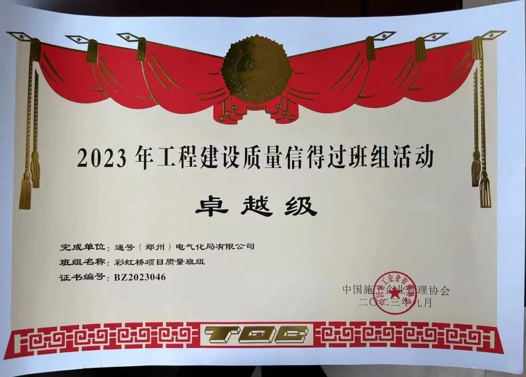 中秋节前夕,通号电气化局郑铁公司选送的郑州彩虹桥项目管理班组在中国施工企业管理协会举办的2023年度工程建设质量信得过班组建设活动中荣获一等奖(卓越级),在600多家企业班组中位列第13名,项目团队及参赛选手用优异成绩为双节献礼。