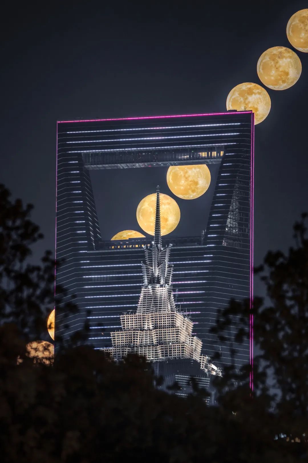 《环金串月》我通过堆栈完整记录下了月球的移动轨迹,远远看去,就像一串珍珠从陆家嘴的地标建筑后面升起,充满棱角和几何感的摩天大楼与圆润天然的月亮同框的画面有一种和谐互补的美,让我不由得联想到“天圆地方”。