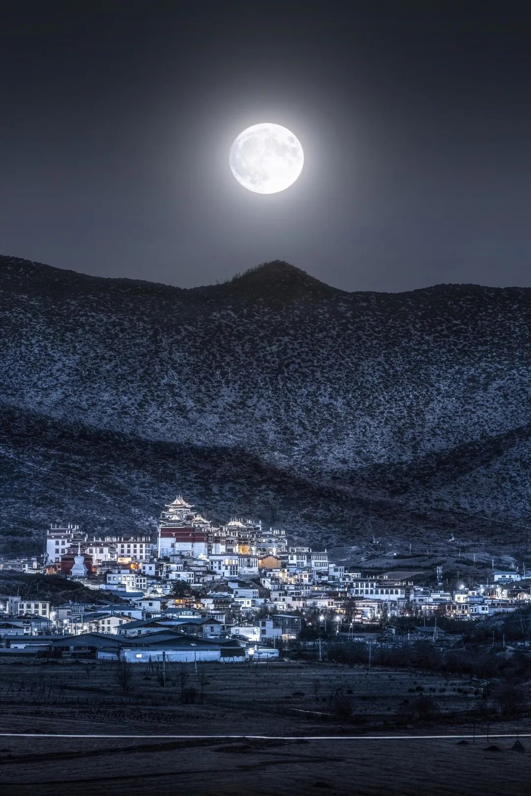 《月升王国》我的第一张月亮照片拍摄于2020年12月30日,画面中的建筑是位于云南香格里拉、有着“小布达拉宫”美誉的噶丹·松赞林寺。