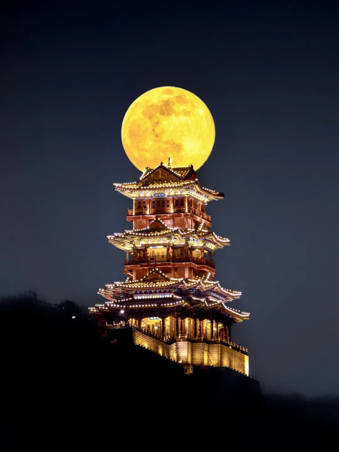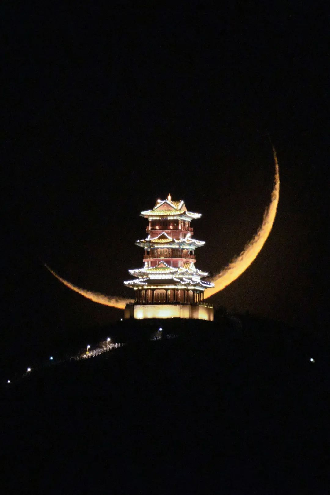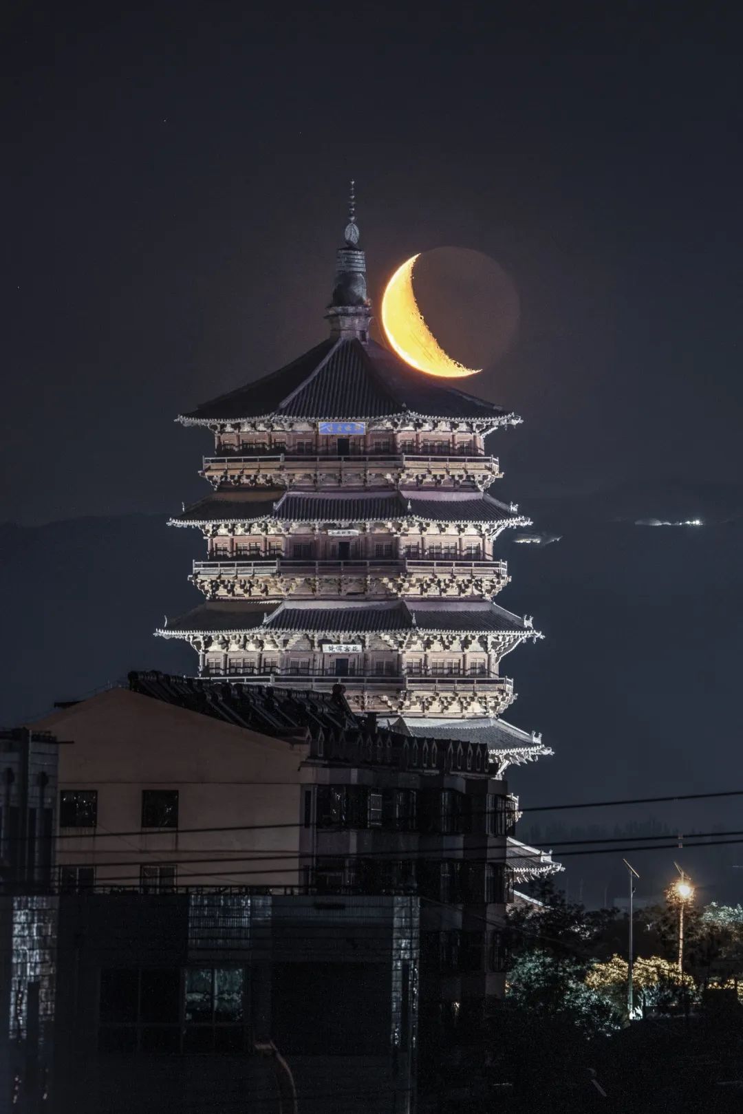 画面中,一弯亏眉月缓缓从具有近千年历史的应县木塔背后升起。作为世界上现存最古老、最高大的木塔,应县木塔堪称木构建筑的奇迹。当明月与千年木塔同框,如何叫人不想到“古人不见今时月,今月曾经照古人”的诗句,古建筑与月亮同框似乎总能带来一种时空交错的美。