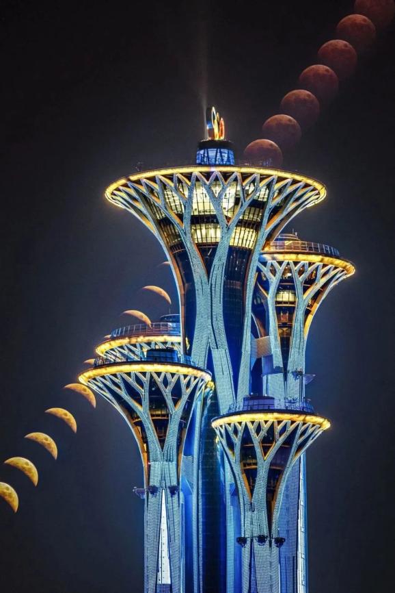 这张照片后来也让我有幸获得了2022年北京天文馆天文摄影师大赛城市组二等奖,入选了第十三届中国艺术节全国优秀摄影作品展览并在包括中国美术馆在内的多家美术馆展出。从此之后,我更加坚定了“月亮一定要实拍、不要合成”这一理念,并不断挑战不同城市的地景和地标建筑,直到现在。