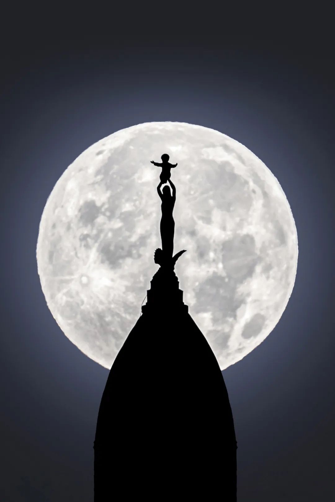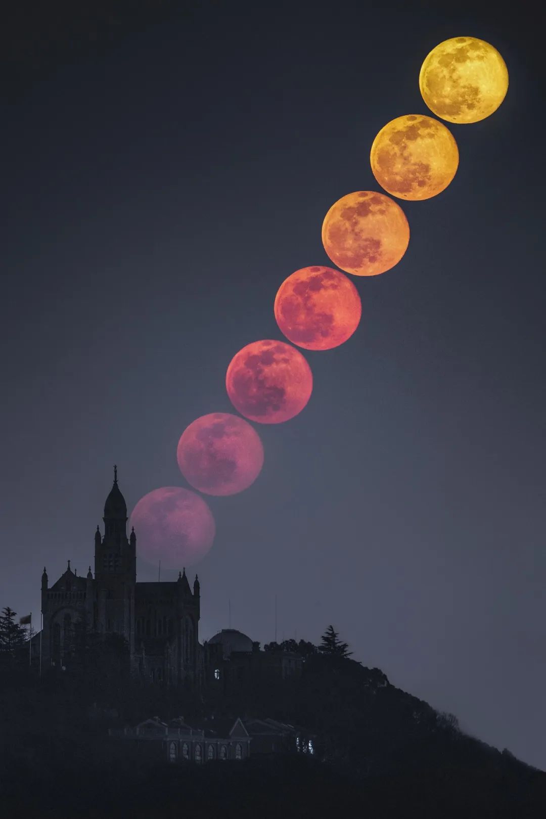 《圣母子望月》而这张《七彩满月升佘山》,可以看到月亮升起时大小和颜色的变化,呈现出的氛围感也截然不同:教堂顶的圣母子雕塑呈现出宗教独有的神圣静谧感,七彩的月升则如同绚丽的龙珠,也许这就是拍月亮的魅力所在吧!