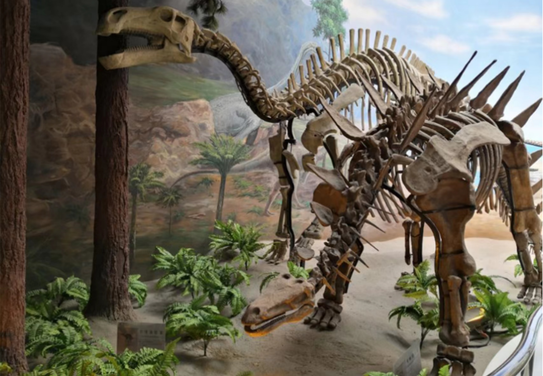 右侧是大型剑龙类恐龙——多棘沱江龙