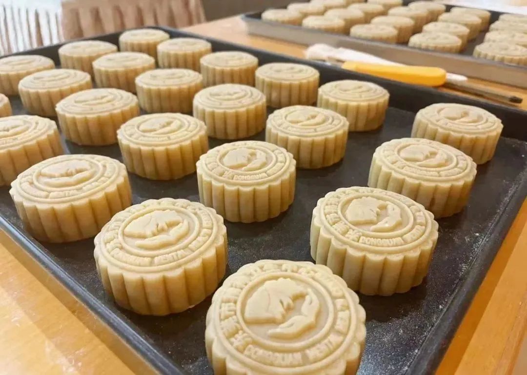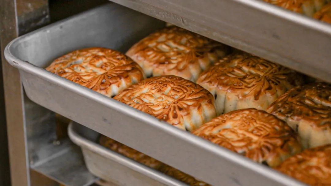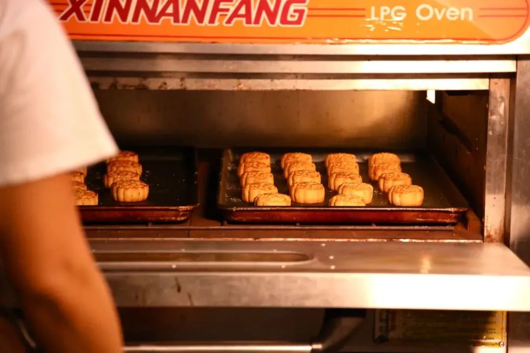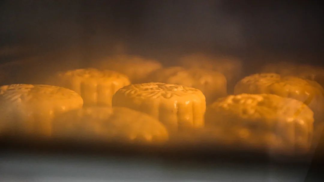 摄影:钟洪亮烤箱里新鲜出炉的月饼,一个个金黄饱满、皮薄馅多,香气扑鼻。