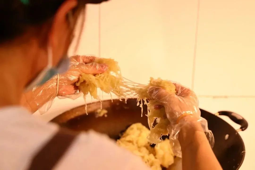 原料选用本地优质的灰皮老冬瓜,坚持纯手工制作,从馅料到成品历经8道工序,耗时5小时,全部靠人工亲力亲为。