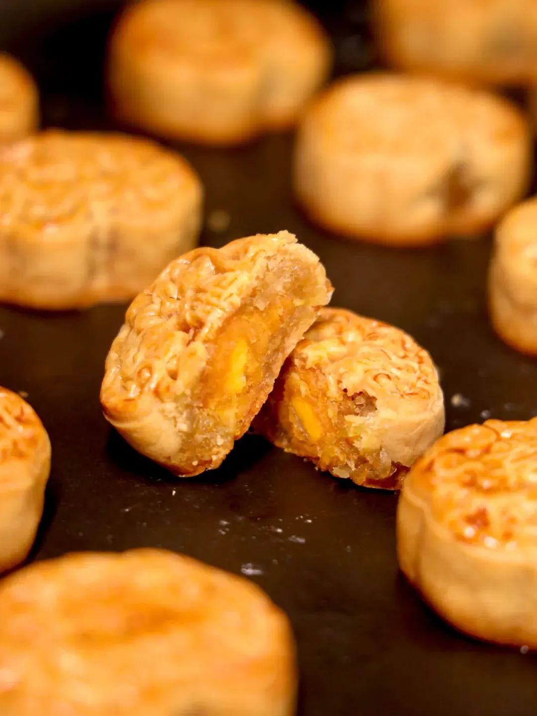 香浓的蛋液给月饼带来金黄的外皮,皮薄馅大、口感酥软,精致的各式印纹包裹在饼面上。