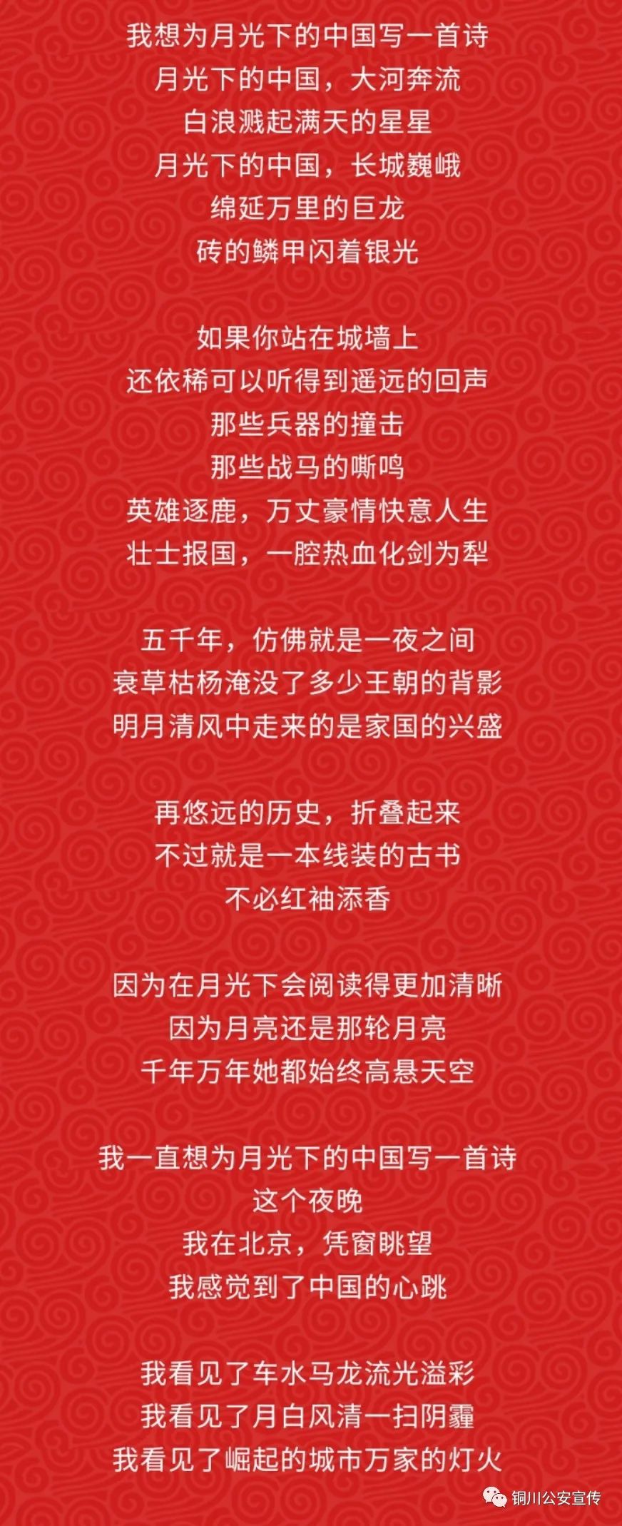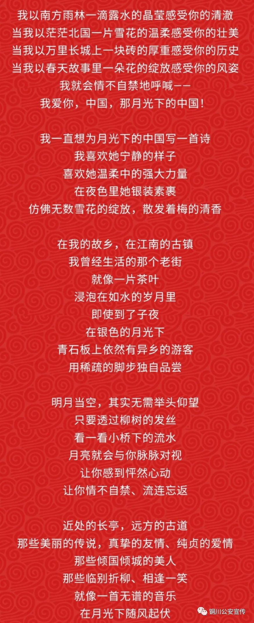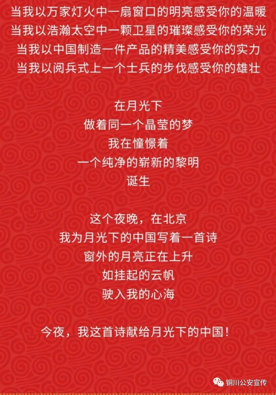 原标题:《【铜川公安】“礼赞祖国”微朗诵|《月光下的中国》》