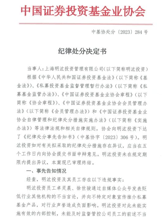 中基协发布的纪律处分决定书显示,经查,明汯投资员工卓灵晨、徐世骏通过自媒体公众号发表贬低行业其他机构的不当言论,并向不特定对象宣传推介私募基金产品,对行业声誉造成负面影响。明汯投资对此未能实施有效的内部控制,未能及时监督管控公司员工的前述不当行为,亦未能及时督促员工规范整改,构成未履行谨慎勤勉义务的违规情形。