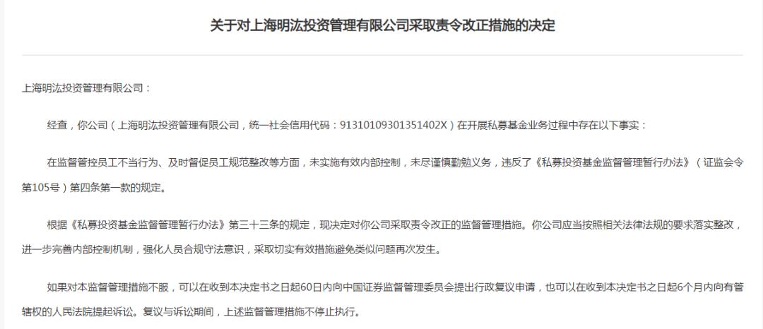 8月底,上海证监局也对明汯投资采取责令改正措施,两份处罚均源于同行对公众号发布文章一事的实名举报。