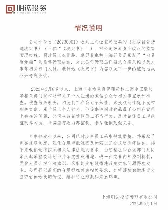 明汯投资称,2023年5月8日以来,上海市市场监督管理局和上海市证监局等相关部门就市场部员工个人注册的微信公众号相关事宜展开核查。核查结果表明,相关员工在公司不知情、未授权的情况下发布相关文章,属于员工个人行为。但该事件同时也暴露了公司在管理上存在的问题,公司在监督管控员工不当行为、及时督促员工规范整改等方面,未实施有效内部控制,未尽谨慎勤勉义务。
