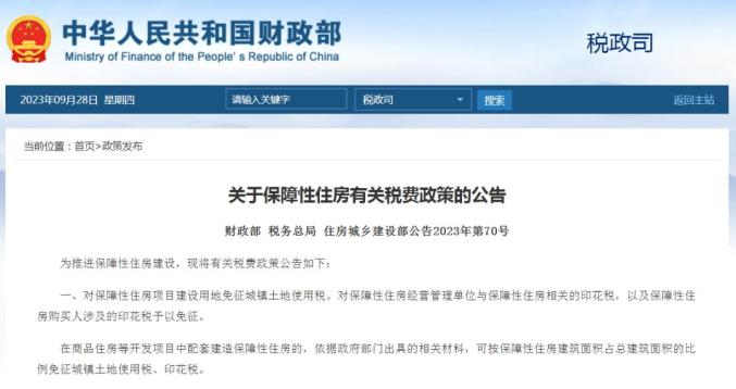 财政部、税务总局、住房城乡建设部9月28日发布《关于保障性住房有关税费政策的公告》,其中提出对保障性住房项目建设用地免征城镇土地使用税。对保障性住房经营管理单位与保障性住房相关的印花税,以及保障性住房购买人涉及的印花税予以免征。对个人购买保障性住房,减按1%的税率征收契税。