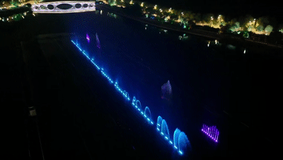 伴随着悠扬的音乐,湖中的音乐喷泉直冲而起,在五彩灯的烘托下,犹如美丽的女子翩翩起舞,随着或舒缓或高亢的音乐,形成多种优美的图案,千变万化的喷泉造型,气势磅礴。
