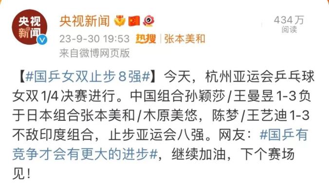 9月30日下午,杭州亚运会乒乓球比赛继续进行,在率先进行的男双1/4决赛中,中国组合林高远/梁靖崑2比3不敌中国台北组合庄智渊/林昀儒无缘4强,国乒迎来本届亚运会首败。刚刚爆冷!国乒亚运首败而随后在女双1/4决赛中,中国组合孙颖莎/王曼昱1-3负于日本组合张本美和/木原美悠;