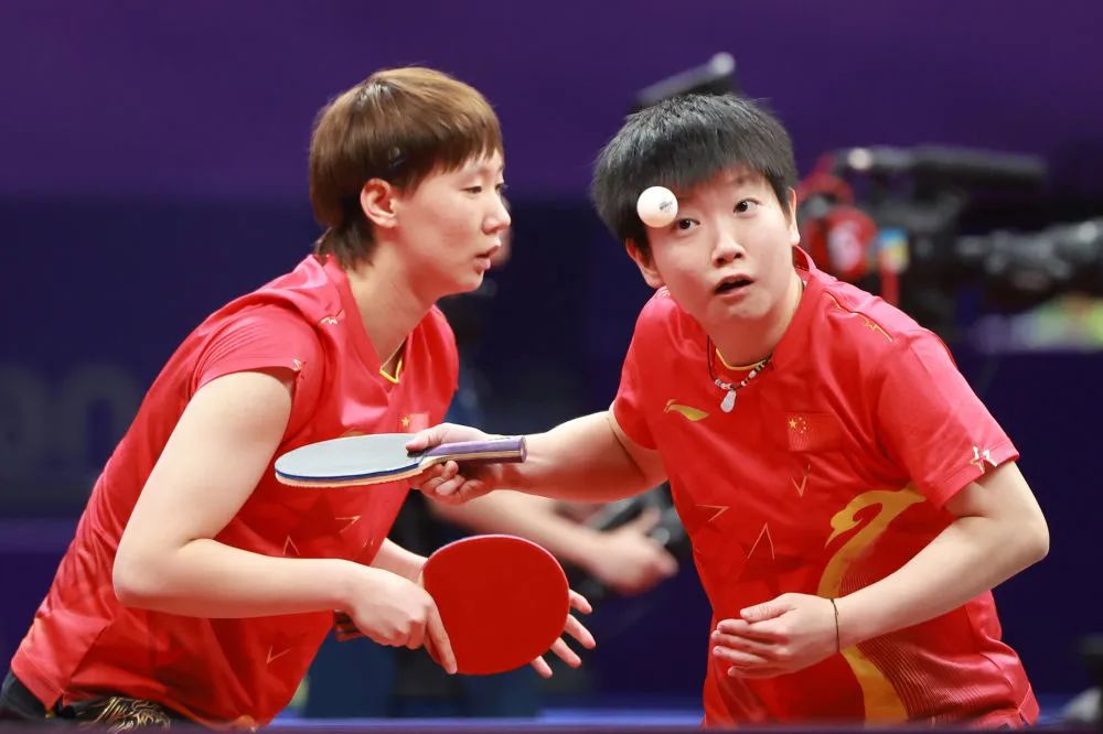 9月30日,孙颖莎(右)/王曼昱在比赛中。新华社记者 刘续 摄
