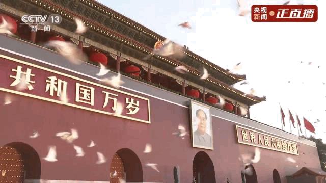 在军乐团《歌唱祖国》的乐曲中人群中欢呼声、呐喊声、歌声此起彼伏
