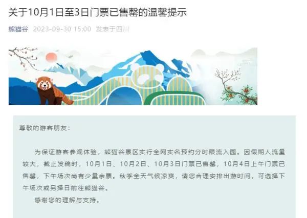 9月30日,熊猫谷微信公众号发布提示,10月1日、10月2日、10月3日门票已售罄,10月4日上午门票已售罄,下午场次尚有少量余票。请合理安排出游时间,可选择下午场次或另择日前往熊猫谷。