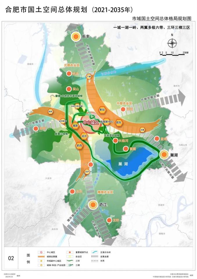 合肥的城市空间格局,其结构可以概括为:“一城一湖一岭、两翼多极六带、三环三楔三区”;发展战略可以概括为:“中心引领、两翼齐飞、多极支撑、岭湖辉映、六带协同”。规划期内,按照市委市政府的统一决策部署,合肥市将按国土空间总体规划和相关专项规划,高品质建设环巢湖旅游休闲圈、骆岗公园、江淮运河百里画廊、未来大科学城等一批世界级的科创文旅新地标,体现合肥市“科里科气”的城市特质,打造 “大湖风光、江淮风韵、创新风尚”的城乡风貌景观。