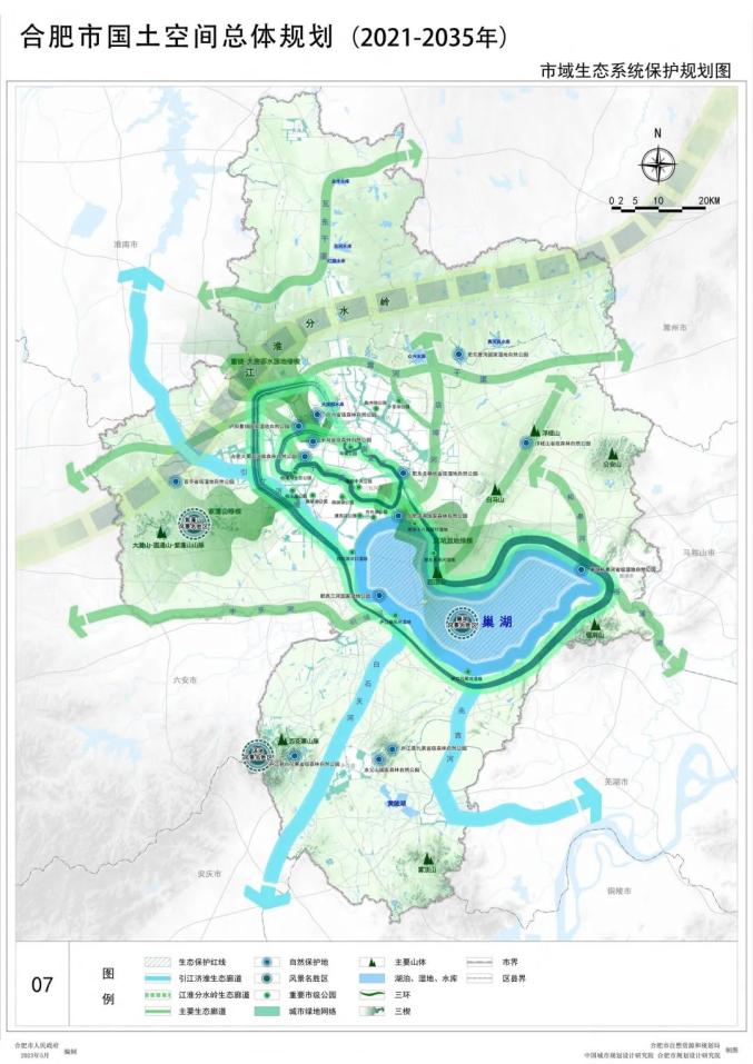 董磊告诉记者,本轮合肥市国土空间总体规划中,将合肥市“田园楔入、星状放射”的经典城市形态进行了延续,展示了“以水为魂、群湖为核”的布局特色,传承了合肥市环城公园“翡翠项链”的经典模式。