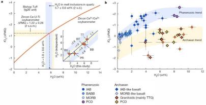 大陆地壳的形成塑造了地球的表面形态,影响了地球的内部成分和结构,造就了人类赖以生存的宜居地球和矿产资源。一般认为,现代大陆地壳的形成与板块俯冲引起的岛弧岩浆作用密切相关,然而,早期大陆地壳是否形成于类似俯冲的构造环境,还是其他特殊的构造体制,是地球科学领域悬而未决的难题。现代岛弧岩浆的特征是相对较高的氧逸度和水含量,但由于构成早期大陆地壳的太古宙岩石普遍遭受了后期变质作用的改造,其岩浆氧逸度和水含量缺乏可靠的制约手段。针对这一难题,该研究团队结合两种基于锆石微量元素的氧逸度计,创新性地提出了锆石氧逸度-湿度计,该方法可以根据锆石结晶时的氧逸度,计算平衡岩浆的水含量,准确度在1 wt%(wt%:重量百分比)以内(图1a)。