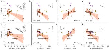 图1 (a)锆石氧逸度-湿度计的基本原理,以Bishop凝灰岩为例,插图中的线性关系显示该方法的准确性;(b)太古宙与显生宙岩浆氧逸度和水含量对比,其中红、黄、紫色为本文锆石氧逸度-湿度计结果。在此基础上,该研究团队计算了全球主要克拉通太古宙内花岗质岩石的岩浆氧逸度和水含量,发现大多数太古宙花岗质岩浆的氧逸度比现代岛弧岩浆低(图1b),但由于太古宙地幔本身氧逸度较低,大多数太古宙花岗质岩浆的氧逸度相对于同期幔源岩浆仍有一个数量级的升高,这种差异类似于现代岛弧岩浆相对于洋脊玄武质岩浆的变化。研究还发现,大多数太古宙花岗质岩浆具有较高的水含量(6 – 10wt%)和H2O/Ce比值(大于1000),类似于现代岛弧岩浆,且岩浆氧逸度、水含量和H2O/Ce比值均与指示岩浆形成深度的地球化学指标具有良好的相关性(图2),指示大量的水被从地表运输至深部地壳和地幔。这些观察难以用非板块俯冲模型解释,而与大洋板片俯冲、脱水、熔融及其导致的岛弧岩浆作用相吻合,说明大量的液态水(大洋)和板块构造在早期大陆起源过程中起着至关重要的作用,这也是宜居地球的形成过程区别于其他类地行星的重要原因,这一过程也对许多关键金属矿产的形成具有重要控制作用。该研究还显示,在地球形成后约5亿年的始太古代(36 – 40亿年前),初始俯冲作用的启动导致花岗质岩浆的氧逸度和水含量发生了显著的升高(图3)。