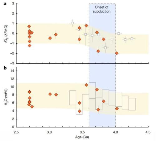 图3 始太古代(40 – 36亿年)花岗质岩浆氧逸度和水含量的升高指示俯冲启动,红色为太古宙花岗质岩石数据,白色方框为澳大利亚Jack Hills碎屑锆石数据该项研究由南京大学和澳大利亚科廷大学合作完成,南京大学为第一完成单位,葛荣峰教授为论文的第一作者和通讯作者,该工作得到了国家自然科学基金优秀青年基金项目、面上项目和杰出青年基金项目的资助。