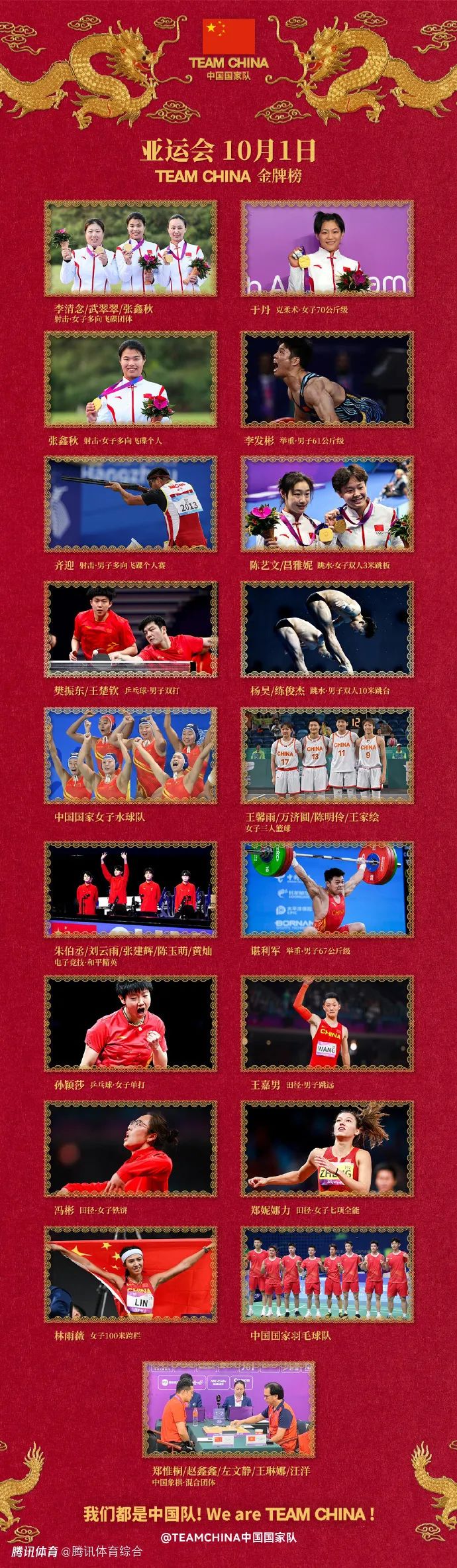 第121金:樊振东/王楚钦获得乒乓球男双金牌:杭州亚运会乒乓球男双决赛,中国组合樊振东/王楚钦4-0横扫韩国组合张禹珍/林钟勋夺得金牌,单局比分依次是11-6、11-8、11-7、11-3。第122金:练俊杰/杨昊获得跳水男子双人10米跳台金牌:杭州亚运会跳水男子双人10米跳台,练俊杰/杨昊总分492.63分夺得金牌,领先第二名超过100分。
