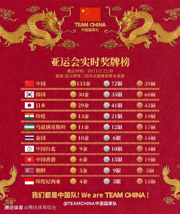 第132金:中国羽毛球队获得男团金牌:杭州亚运会羽毛球男团决赛,石宇奇与梁伟铿/王昶先输两场,随后李诗沣、刘雨辰/欧烜屹与翁泓阳连赢三场,最终上演让二追三史诗逆转,总分3-2逆转击败印度队实现卫冕获得金牌。第133金:中国队获得象棋混合团体金牌:杭州亚运会象棋混合团体决赛,中国队3-0战胜越南队获得金牌。