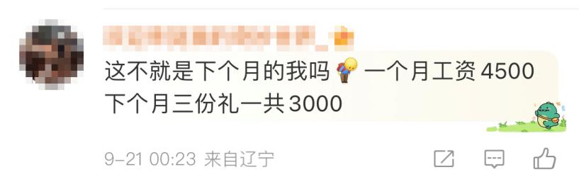 一位来自辽宁的网友卑微发言:“这不就是下个月的我吗?一个月工资4500,下个月三份礼一共3000。”