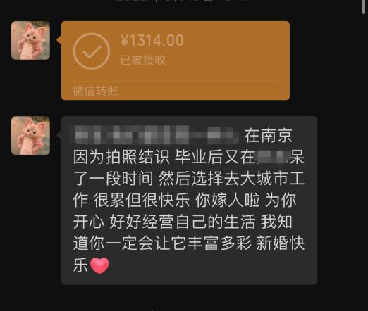 去年Bella结婚时,她大学时的闺蜜给她搭的份子钱是1314元,闺蜜还说:“除了爱情,友情同样值得1314。”
