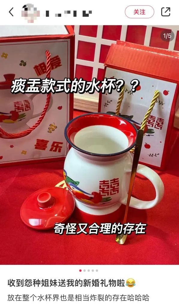 还有新娘收到的新婚礼物,是一个痰盂款式的水杯。就是说,这个杯子放在整个水杯界也是相当炸裂的存在,有那味了~