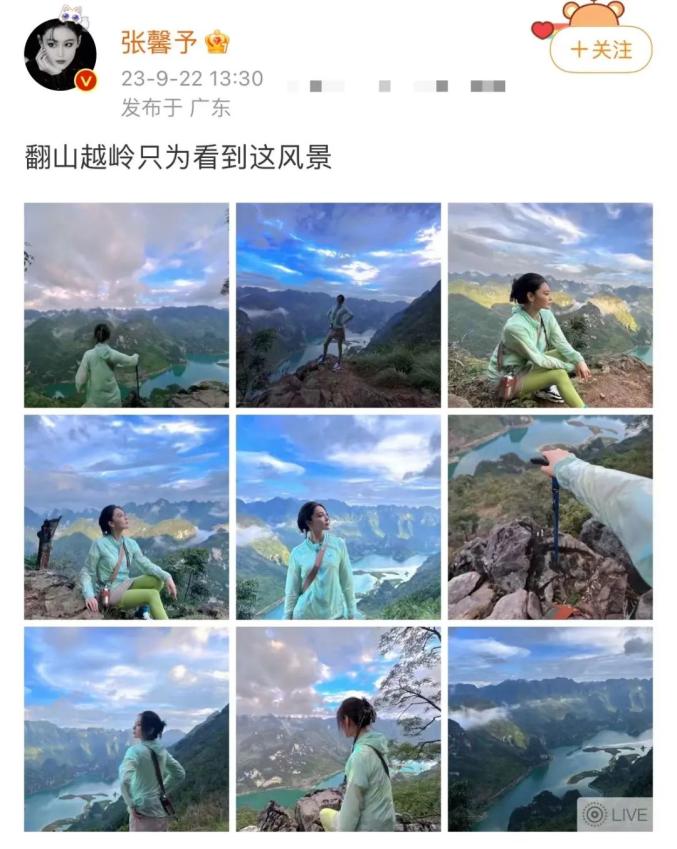 起因是,9月22日,演员张馨予在个人微博晒出了几张自己的旅行照,并配文:翻山越岭只为看到这风景 。
