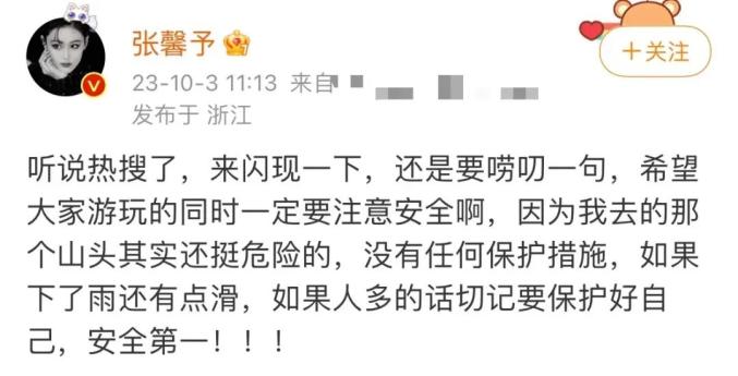 在#广西一座山因张馨予打卡成网红#登上热搜后,张馨予本人也在微博发布提醒:“希望大家游玩的同时一定要注意安全啊,因为我去的那个山头其实还挺危险的,没有任何保护措施。”