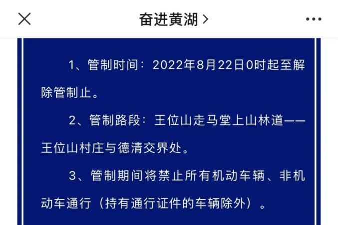 但在当时,王位山不是正规景点,没有相应的管理措施。黄湖镇政府官方微信公号“奋进黄湖”紧急发布通告:8月22日0时起对王位山部分道路实行交通管制,禁止除持通行证车辆外的所有机动车、非机动车通行。